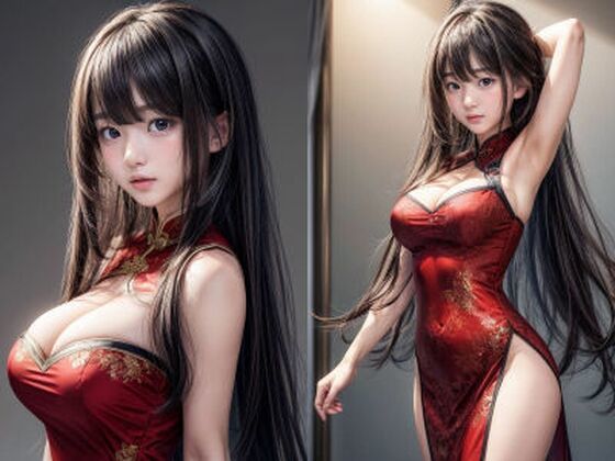 【無料】[無料]黒髪/ロングヘア/程よいおっぱいサイズ/赤チャイナドレス/胸の谷間強調「リアル・実写系」写真集
